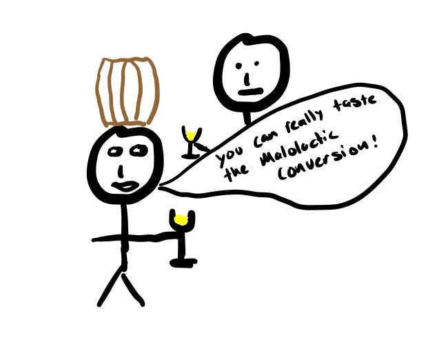 That’s when you realize that the lovely full-bodied Chardonnays that you so enjoy is made in the winery. You realize that it’s because the winemaker aged it in new oak (or more likely with oak staves) and the new oak imparted flavors of vanilla into the wine . You learn that the buttery notes you sometimes get in these come from something called malolactic conversion. Even though you have no clue what it is, you still say it at awkward moments when you drink a glass of wine with your friends “Oh you can really taste the malolactic conversion in this thing”.