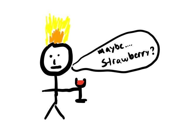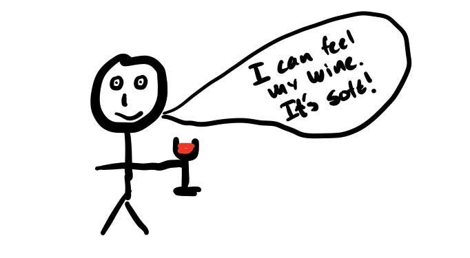 At this point though you’re very likely confusing your sense of smell and taste with your sense of vision. You see the glass in your hand, your know it’s wine, so you answer “it’s wine”. This is the first hint towards realizing that there’s a level of experience that you’re not experiencing. Maybe you read a wine review and thought “that’s bullshit, nobody can taste white flowers and fresh peach in glass of wine. Why would you eat rocks?!”.